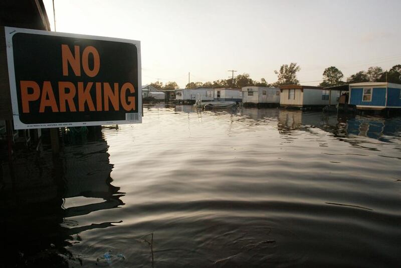 A "No parking" sign states the obvious as shown on a driveway near a trailer park flooded by Hurricane Rita September 26, 2005 in Delcambre, Louisiana. (Scott Olson/Getty Images)