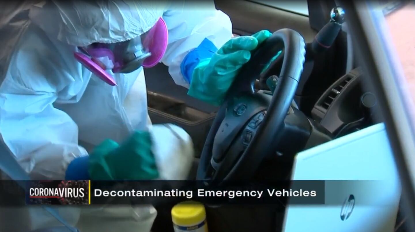 Wearing full personal protective equipment, workers cleaned and disinfected emergency vehicles as well as ambulances.