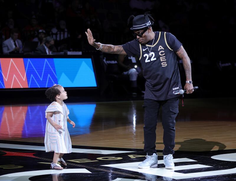 Photos: Coolio through the years 2022: Rapper/actor Coolio and his granddaughter Arya Ivey perform at halftime of a game between the Connecticut Sun and the Las Vegas Aces at Michelob ULTRA Arena on May 31, 2022, in Las Vegas. (Ethan Miller/Getty Images)