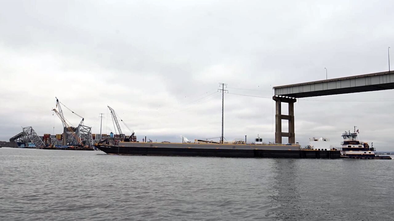 Francis Scott Key Bridge collapse This still from a U.S. Coast Guard video shows the tugboat Crystal Coast pushing a fuel barge through the temporary alternate channel created by the Key Bridge Response Unified Command, near the Key Bridge incident, in Baltimore, Maryland, on April 1, 2024. The Crystal Coast is the first vessel to use the channel since the bridge collapsed into the federal waterway on March 26th. (Petty Officer 2nd Class Taylor Bacon/U.S. Coast Guard)