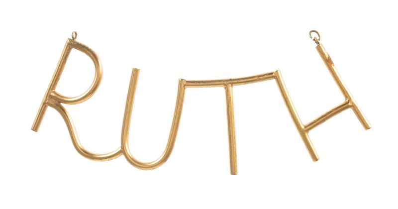 Photos: Treasures for sale in “Hollywood Legends” auction A gold-tone monogram "RUTH" necklace attachment with hoops on each corner for suspension, done using Joseff of Hollywood's signature Russian plating technique . Worn by Olivia de Havilland in "The Dark Mirror" (Universal, 1946), where de Havilland took on dual roles portraying twins Ruth and Terry Collins. This custom jewelry piece, designed as an extra monogram to the original by Joseff, provided important visual cues identifying each twin on screen. From The Collection of Joseff of Hollywood. (Julien's Auctions)