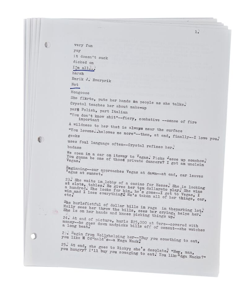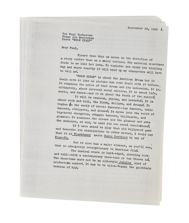 Photos: Treasures for sale in “Hollywood Legends” auction "A working first draft of the screenplay for the cult classic film Showgirls (Carolco Pictures, 1995), signed by screenwriter Joe Eszterhas. This document was used by Eszterhas and director Paul Verhoeven when they met in Maui, HI to discuss the screenplay, and includes edits and annotations contributed by both, hand-written by Eszterhas.