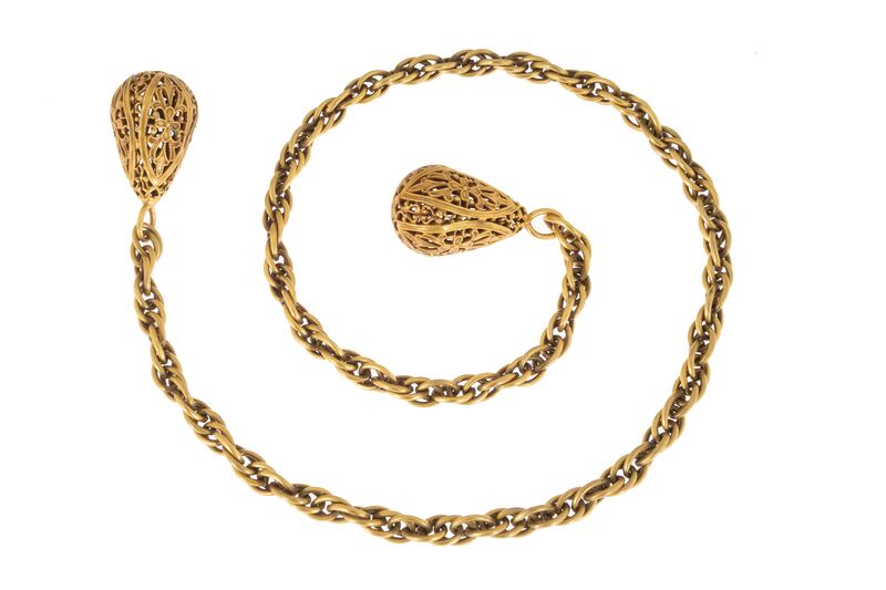 Photos: Treasures for sale in “Hollywood Legends” auction A gold-tone fancy link chain necklace terminating in drop-shaped openwork filigree terminals, done using Joseff of Hollywood's signature Russian plating technique. Joseff designed this necklace to be worn on its own or paired with multiple strands for a more dramatic effect. Rita Hayworth was photographed during a photoshoot demonstrating the multi-strand effect of the necklace. Judy Garland was also photographed modeling the single-strand version of this necklace, and the image was used on the cover of her 1951 albumJudy at the Palace: Judy Garland Singing Songs She Made Famous.