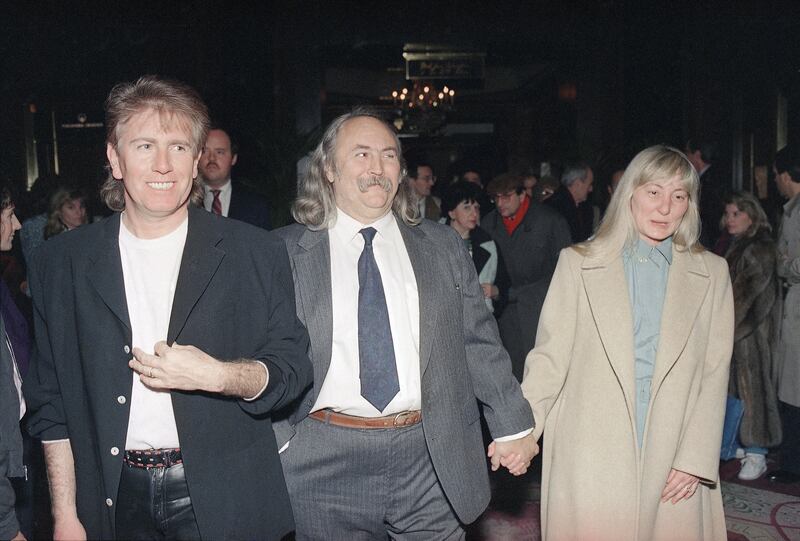 Photos: Graham Nash through the years 1993: Arriving to attend the ceremonies at the Rock and Roll Hall of Fame in New York, Jan. 13, 1993, are Graham Nash (left) and David Crosby and his wife, Jan Dance. Nash and Crosby were part of the group Crosby, Stills & Nash. (AP Photo/Frankie Ziths)