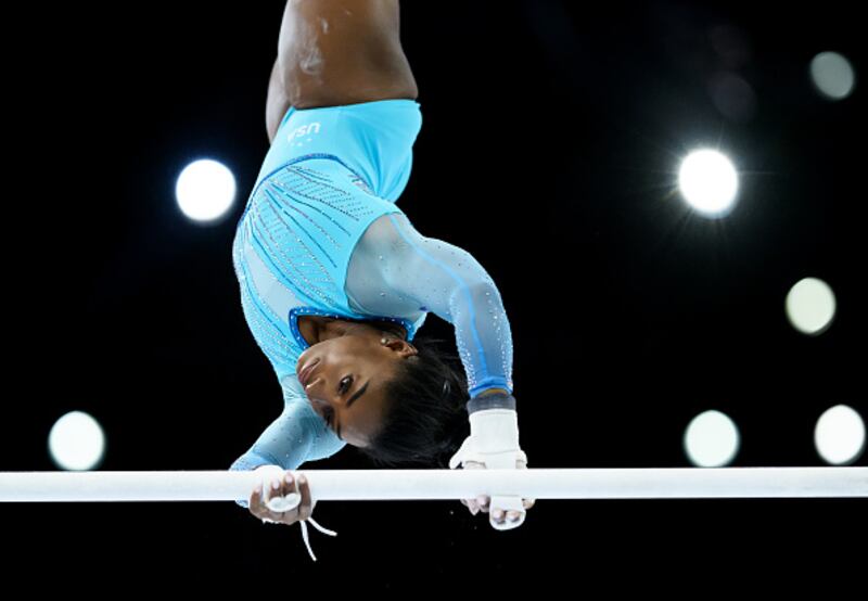 2023 Artistic Gymnastics World Championships ANTWERP, BELGIUM - SEPTEMBER 28: Simone Biles of United States practices on the uneven bars uring the 2023 FIG Artistic Gymnastics World Championships Training Session at the Antwerp Sportpaleis on September 28, 2023 in Antwerp, Belgium. (Photo by Matthias Hangst/Getty Images) (Matthias Hangst/Getty Images)
