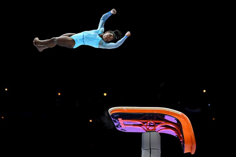 2023 Artistic Gymnastics World Championships ANTWERP, BELGIUM - OCTOBER 01: Simone Biles of Team United States competes on Vault during Women's Qualifications on Day Two of the FIG Artistic Gymnastics World Championships at the Antwerp Sportpaleis on October 01, 2023 in Antwerp, Belgium. (Photo by Matthias Hangst/Getty Images) (Matthias Hangst/Getty Images)