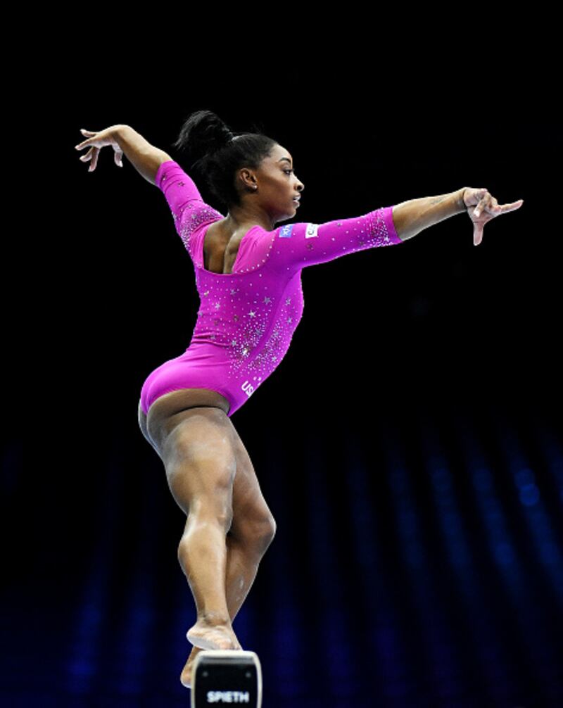 2023 Artistic Gymnastics World Championships ANTWERP, BELGIUM - SEPTEMBER 28: Simone Biles of United States practices on the balance beam during the 2023 FIG Artistic Gymnastics World Championships Training Session at the Antwerp Sportpaleis on September 28, 2023 in Antwerp, Belgium. (Photo by Matthias Hangst/Getty Images) (Matthias Hangst/Getty Images)