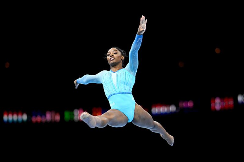2023 Artistic Gymnastics World Championships ANTWERP, BELGIUM - SEPTEMBER 28: Simone Biles of United States practices her floor routine during the 2023 FIG Artistic Gymnastics World Championships Training Session at the Antwerp Sportpaleis on September 28, 2023 in Antwerp, Belgium. (Photo by Matthias Hangst/Getty Images) (Matthias Hangst/Getty Images)