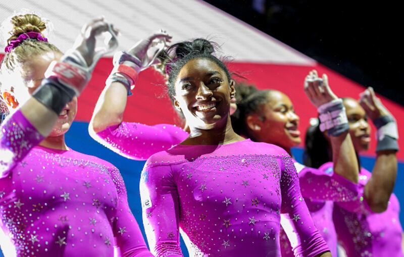 2023 Artistic Gymnastics World Championships ANTWERP, BELGIUM - OCTOBER 01: Simone Biles of the Team United States reacts during Women's Qualifications on Day Two of the FIG Artistic Gymnastics World Championships at the Antwerp Sportpaleis on October 01, 2023 in Antwerp, Belgium. (Photo by Matthias Hangst/Getty Images) (Matthias Hangst/Getty Images)