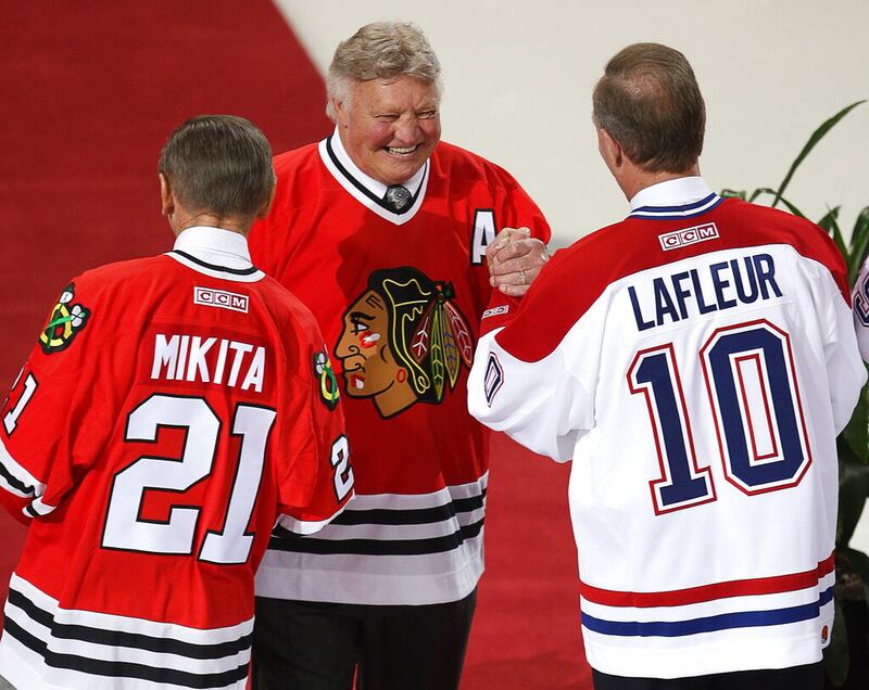 Through the years Chicago Blackhawks legend Bobby Hull shakes hands with Montreal Canadiens legend Guy Lafleur as Blackhawks Stan Mikita looks on during a pre-game cermony Tuesday, Jan. 8, 2008 in Montreal. (AP Photo/The Canadian Press, Paul Chiasson) (Paul Chiasson/ASSOCIATED PRESS)