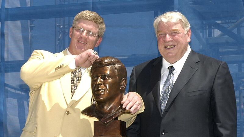 John Madden through the years 2014: Former NFL punter Ray Guy, left, poses with his bust and former coach John Madden, right, during the NFL Class of 2014 Pro Football Hall of Fame Enshrinement Ceremony at Fawcett Stadium on August 2, 2014 in Canton, Ohio. (Photo by Jason Miller/Getty Images, File) (Jason Miller/Getty Images)