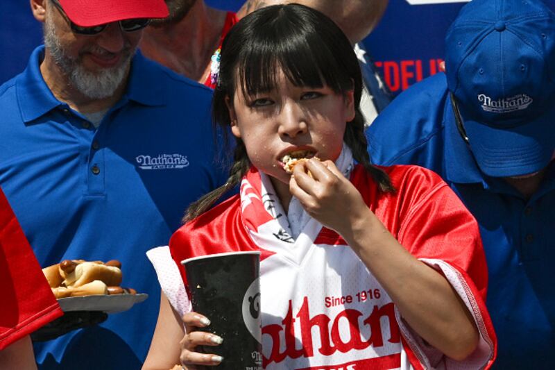 Nathan's Annual Hot Dog Eating Contest NEW YORK, NEW YORK - JULY 04: Mayoi Ebihara competes during the 2023 Nathan's Famous Fourth of July International Hot Dog Eating Contest at Coney Island on July 04, 2023 in the Brooklyn borough of New York City. The annual contest, which began in 1972, draws thousands of spectators to Nathan’s Famous located on Surf Avenue. (Photo by Alexi J. Rosenfeld/Getty Images) (Alexi Rosenfeld/Getty Images)