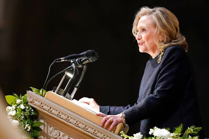 Madeleine Albright memorial Former Secretary of State Hillary Clinton speaks during the funeral service for former Secretary of State Madeleine Albright at the Washington National Cathedral, Wednesday, April 27, 2022, in Washington. (AP Photo/Andrew Harnik) (Andrew Harnik/AP)