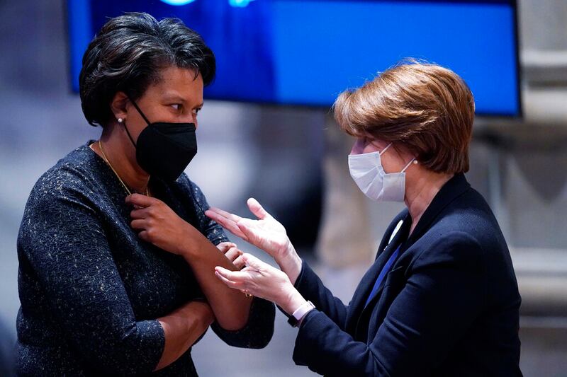 Remembering Madeleine Albright Washington Mayor Muriel Bowser, left, talks to Sen. Amy Klobuchar, D-Minn., before the start of the funeral service for former Secretary of State Madeleine Albright at the Washington National Cathedral, Wednesday, April 27, 2022, in Washington. (AP Photo/Evan Vucci) (Evan Vucci/AP)