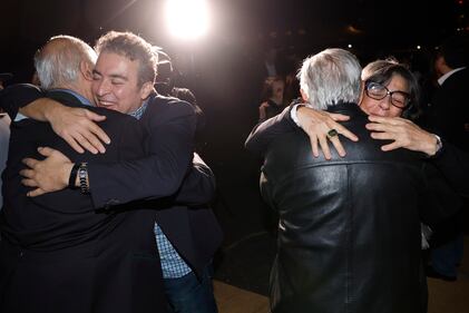 Return to the U.S. A family member embraces freed American Siamak Namazi after he and four fellow detainees were released in a prisoner swap deal and arrive at Davison Army Airfield, Tuesday, Sept. 19, 2003 at Fort Belvoir, Va. (Jonathan Ernst/Pool via AP) (Jonathan Ernst/AP)