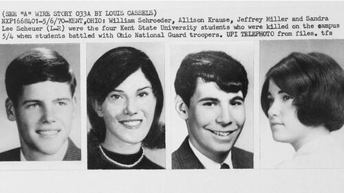 Kent State shootings: From left, William Schraeder, Allison Krause, Jeffrey Miller, and Sandra Lee Scheuer, were killed at Kent State University on May 4, 1970. (Getty Images)