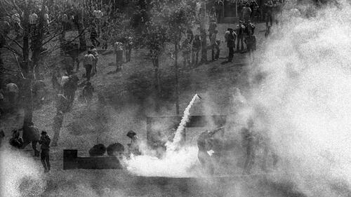 Kent State shootings: Members of the Ohio National Guard use tear gas to disperse a crowd of demonstrators at Kent State University. (Getty Images )