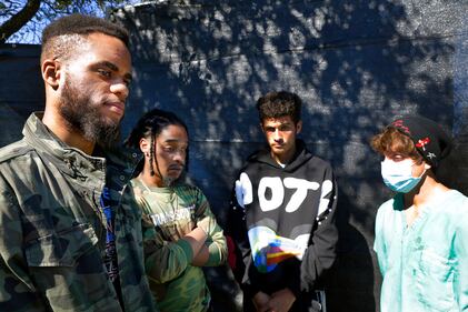 Astroworld aftermath Festival attendants, from left, Brandon Beauval, Joshua Robinson, Andrew Diaz and Billy Nasser talk about their experiences after several people died and scores were injured during the music festival the night before, Saturday, Nov. 6, 2021, in Houston. (AP Photo/Michael Wyke) (Michael Wyke/AP)