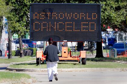 Astroworld aftermath A pedestrian cross Main Street in front of a sign announcing the cancellation of Astroworld on Saturday, Nov. 6, 2021, in Houston. Several people died and numerous others were injured in what officials described as a surge of the crowd at the music festival while Travis Scott was performing Friday night. (AP Photo/Michael Wyke) (Michael Wyke/AP)