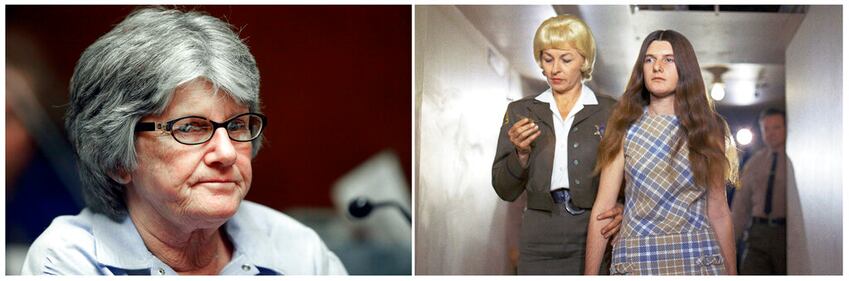 FILE This combination of file photos shows Patricia Krenwinkel being led to superior court in Los Angeles on Feb. 24, 1970, right, and years later at a parole hearing on Jan. 20, 2011. (AP Photo/Reed Saxon, left, and George Brich, right, File)