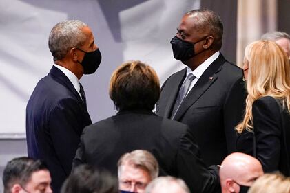 Gen. Colin Powell Funeral Defense Secretary Lloyd Austin talks with former President Barack Obama before the funeral for former Secretary of State Colin Powell at the Washington National Cathedral, in Washington, Friday, Nov. 5, 2021. (AP Photo/Andrew Harnik) (Andrew Harnik/AP)