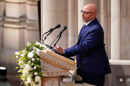 Gen. Colin Powell funeral Michael Powell gives a eulogy for his father, during the funeral for former Secretary of State Colin Powell at the Washington National Cathedral, in Washington, Friday, Nov. 5, 2021. (AP Photo/Andrew Harnik) (Andrew Harnik/AP)