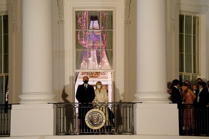 Fireworks light up sky to celebrate Biden's inauguration President Joe Biden and first lady Jill Biden watch fireworks from the White House, Wednesday, Jan. 20, 2021, in Washington. Members of the Biden family wait at right. (AP Photo/Evan Vucci)