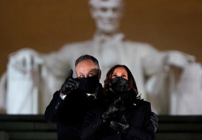 Fireworks light up sky to celebrate Biden's inauguration Vice President Kamala Harris and her husband Doug Emhoff watch fireworks at the Celebrating America concert at the Lincoln Memorial in Washington, Wednesday, Jan. 20, 2021, after President Joe Biden's inauguration. (Joshua Roberts/Pool photo via AP)