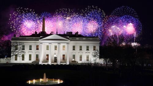 Fireworks light up sky to celebrate Biden's inauguration President Joe Biden and first lady Jill Biden watch fireworks from the White House, Wednesday, Jan. 20, 2021, in Washington. (AP Photo/Evan Vucci)