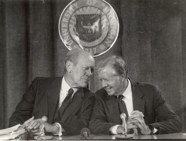 Former U.S. presidents Gerald Ford, left, and Jimmy Carter share a private moment during a symposium on 'New Weapons Technologies and Soviet-American Relations' at the University of Michigan in this Nov. 14, 1984, photo. (AP / Detroit Free Press)