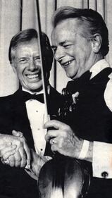 President Jimmy Carter congratulates Senate Majority Leader Robert Byrd after his performance on the fiddle at a Democratic National Committee gala on Sep. 2, 1979. (File)