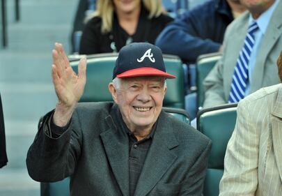 Former President Jimmy Carter waves to fans after he found a seat before the home opener against the Milwaukee Brewers at Turner Field in Atlanta on April 13, 2012. (Hyosub Shin)