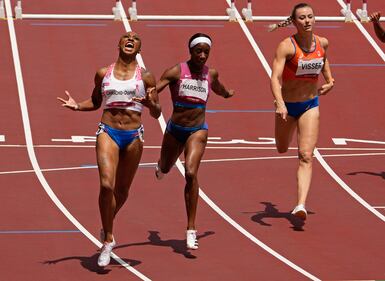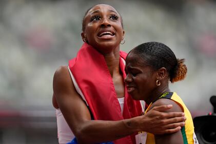 Photos: Kendra 'Keni' Harrison wins silver in 100-meter hurdles at Tokyo Olympics Jasmine Camacho-Quinn, left, of Puerto Rico, is congratulated by Megan Tapper, of Jamaica, after winning the women's 100-meters hurdles final at the 2020 Summer Olympics, Monday, Aug. 2, 2021, in Tokyo. (AP Photo/Petr David Josek)