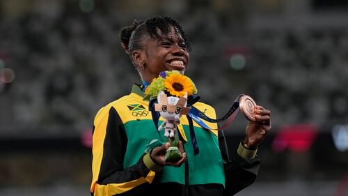 Photos: Kendra 'Keni' Harrison wins silver in 100-meter hurdles at Tokyo Olympics Megan Tapper, of Jamaica, poses with her bronze medal for the women's 100-meters hurdles final at the 2020 Summer Olympics, Monday, Aug. 2, 2021, in Tokyo. (AP Photo/Francisco Seco)