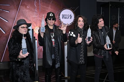 Through the years NEW YORK, NEW YORK - NOVEMBER 30: (L-R) Eric Singer, Gene Simmons, Paul Stanley and Tommy Thayer of KISS pose as they light the Empire State Building in celebration of the band's final show at The Empire State Building on November 30, 2023 in New York City. (Photo by Roy Rochlin/Getty Images for Empire State Realty Trust) (Roy Rochlin/Getty Images for Empire State Re)