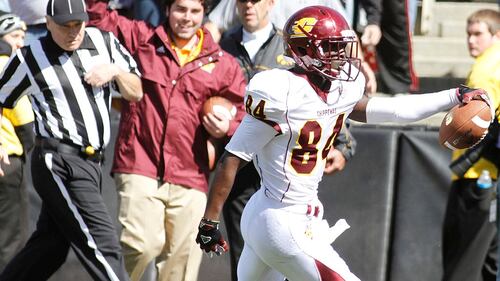 Titus Davis FILE PHOTO: Wide receiver Titus Davis #84 of the Central Michigan Chippewas runs into the endzone during the fourth quarter against the Iowa Hawkeyes on September 22, 2012 at Kinnick Stadium in Iowa City, Iowa. Central Michigan defeated Iowa 32-31. Davis died Nov. 11 from a rare kidney disease. He was 27. (Matthew Holst/Getty Images)