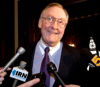Gov James Thompson FILE PHOTO: In this Nov. 10, 2004 file photo, attorney and former Gov. James Thompson is surrounded by reporters at the Illinois Supreme Court in Springfield, Ill. Thompson, known as “Big Jim” during a long career that eventually made him the state's longest-serving chief executive, has died. He was 84. Thompson died Friday, Aug. 14, 2020 at the Shirley Ryan AbilityLab in Chicago, his wife, Jayne, told the Chicago Tribune and the Chicago Sun-Times. (AP Photo/Seth Perlman, File) (Seth Perlman/AP)