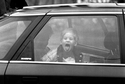 December 1987 Prince Harry arrives at his nursery school in west London and gives a royal welcome to photographers. He later appeared in the school's nativity play, which was watched by his parents. (Photo by PA Images Archive via Getty Images)