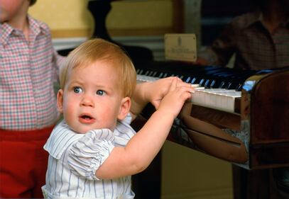 October 1985 Prince Harry plays at the piano at home in Kensington Palace (Photo by Tim Graham/Getty Images)