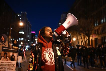Protests in response to video of Tyre Nichols' arrest Protesters rally against the the fatal police assault of a Black man, in Washington, DC on January 27, 2023. - The US city of Memphis released January 27, 2023 graphic video footage depicting the fatal police assault of a 29-year-old Black man, as cities nationwide braced for a night of protests against police brutality. VFive Memphis officers, also all Black, were charged with second-degree murder in the beating of Tyre Nichols, who died in hospital on January 10 three days after being stopped on suspicion of reckless driving. (Photo by ANDREW CABALLERO-REYNOLDS / AFP) (Photo by ANDREW CABALLERO-REYNOLDS/AFP via Getty Images) (ANDREW CABALLERO-REYNOLDS/AFP via Getty Images)