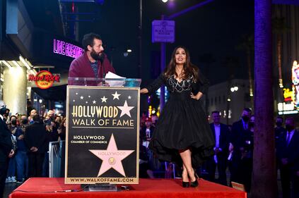 Salma Hayek Adam Sandler, left, speaks during a ceremony honoring Salma Hayek, right, with a star on the Hollywood Walk of Fame, Friday, Nov. 19, 2021, in Los Angeles. (Photo by Jordan Strauss/Invision/AP) (Jordan Strauss/Jordan Strauss/Invision/AP)