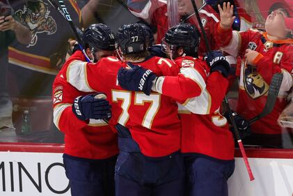 Game 7: Sam Reinhart of the Panthers is mobbed by his teammates after his second-period goal gave Florida a 2-1 lead. (Carmen Mandato/Getty Images)