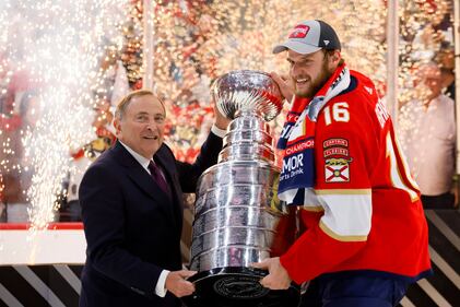 Game 7: NHL Commissioner Gary Bettman and Aleksander Barkov, captain of the Florida Panthers, hold the Stanley Cup after Florida's 2-1 victory against Edmonton in Game 7. (Bruce Bennett/Getty Images)