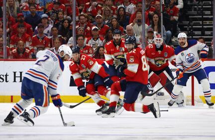 Game 7: Brandon Montour of the Florida Panthers, left, jostles with Edmonton's Warren Foegele in front of the Panthers net. (Andy Devlin/NHLI via Getty Images)