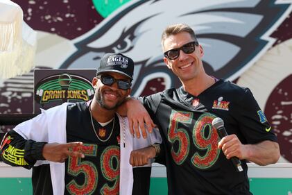 Super Bowl LIX: Grant Jones and A.J. Kirsch DJ enjoy time in the Philadelphia Eagles fan zone before Super Bowl LIX. (Icon Sportswire/Icon Sportswire via Getty Images)