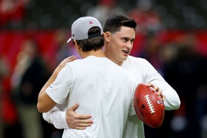 Super Bowl LIX: Braden Mann of the Philadelphia Eagles and Matt Araiza of the Kansas City Chiefs meet on the field before Super Bowl LIX at Caesars Superdome. (Gregory Shamus/Getty Images)