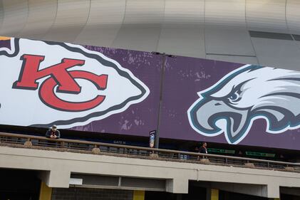 Super Bowl LIX: The Kansas City and Philadelphia Eagles logos are displayed before Super Bowl LIX at the Caesars Superdome in New Orleans. (Icon Sportswire/Icon Sportswire via Getty Images)