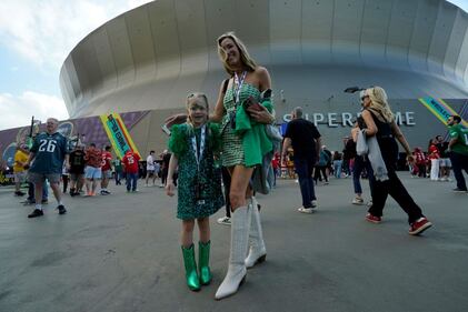 AMFOOT-SUPERBOWL-CHIEFS-EAGLES Philadelphia Eagles fans pose for a picture outside the Superdome before Super Bowl LIX. (TIMOTHY A. CLARY/AFP via Getty Images)