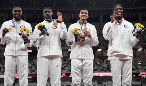 Photos: US tops Tokyo Olympics gold medal count with 39; see every winner Gold medalists (from left) USA's Rai Benjamin, USA's Bryce Deadmon, USA's Michael Norman and USA's Michael Cherry pose for the Victory Ceremony of the men's 4x400m relay event at the Tokyo 2020 Olympic Games at the Olympic Stadium in Tokyo on August 7, 2021. (JAVIER SORIANO/AFP via Getty Images)