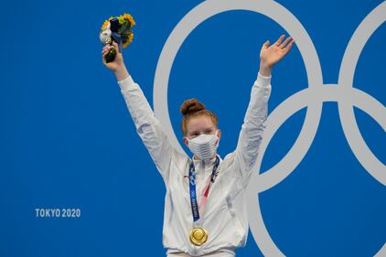 Photos: US tops Tokyo Olympics gold medal count with 39; see every winner Katie Ledecky of the United States poses with her gold medal after winning the women's 1500-meters freestyle final at the 2020 Summer Olympics, Wednesday, July 28, 2021, in Tokyo, Japan. (AP Photo/Matthias Schrader)